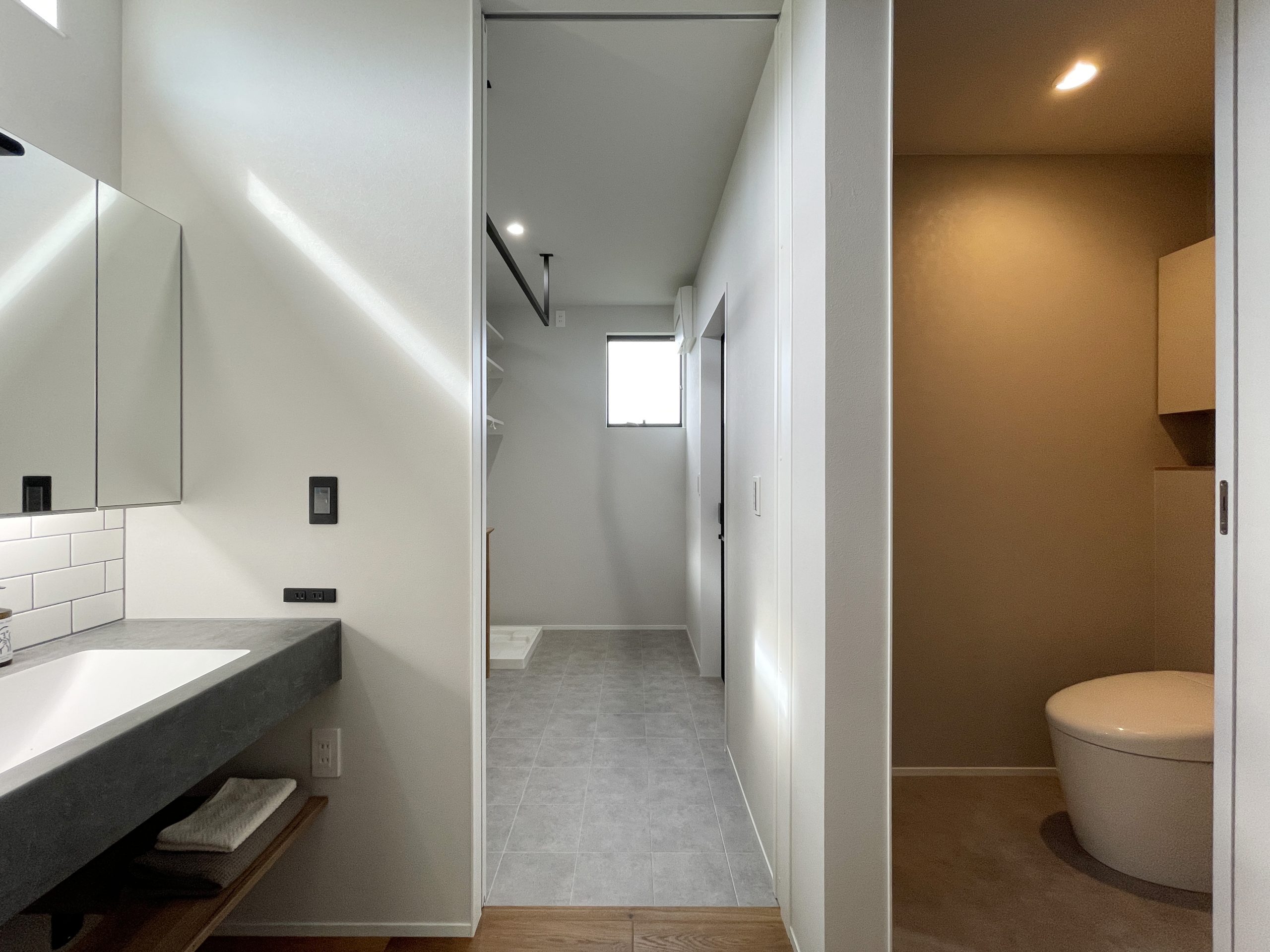 仕事や休日の帰宅後、ムダな動きなく無心で片付いてしまう収納動線まで計画。お出かけ時のスムーズさも工夫しています。