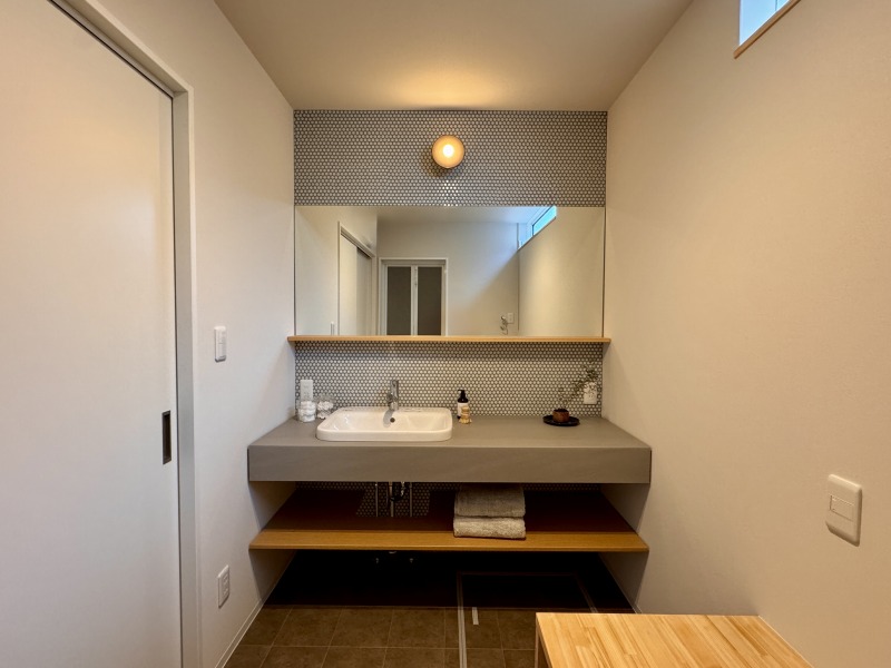 一歩足を踏み入れるとヒノキの床が心地よく、心安らぐ畳スペースが広がります。LDKの一角には、料理と食事を楽しめるダイニングテーブルと、使い勝手とデザインにこだわったオリジナルキッチンを配置。洗面スペースは、落ち着いた色調でまとめ和モダンでシックな雰囲気に。