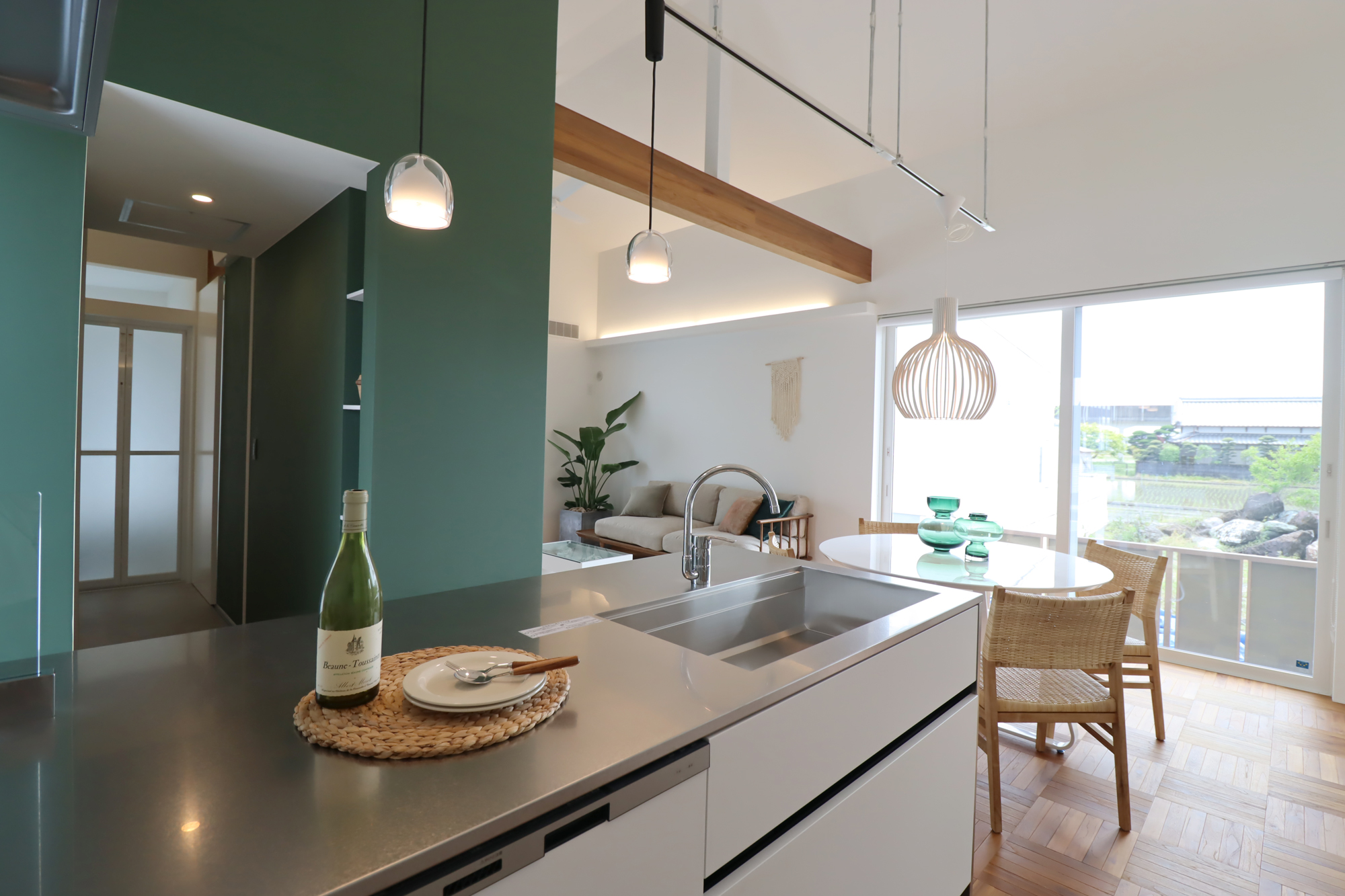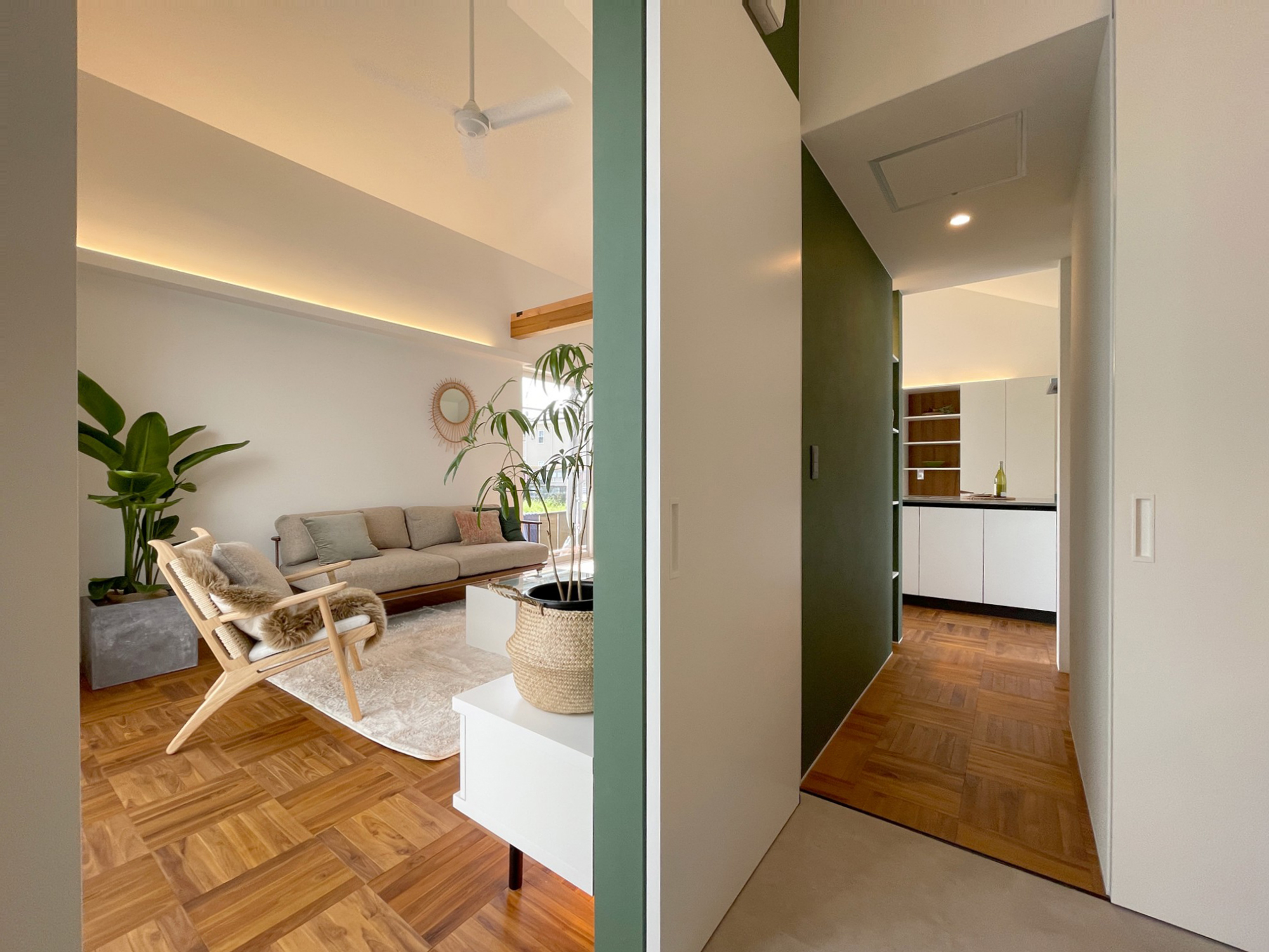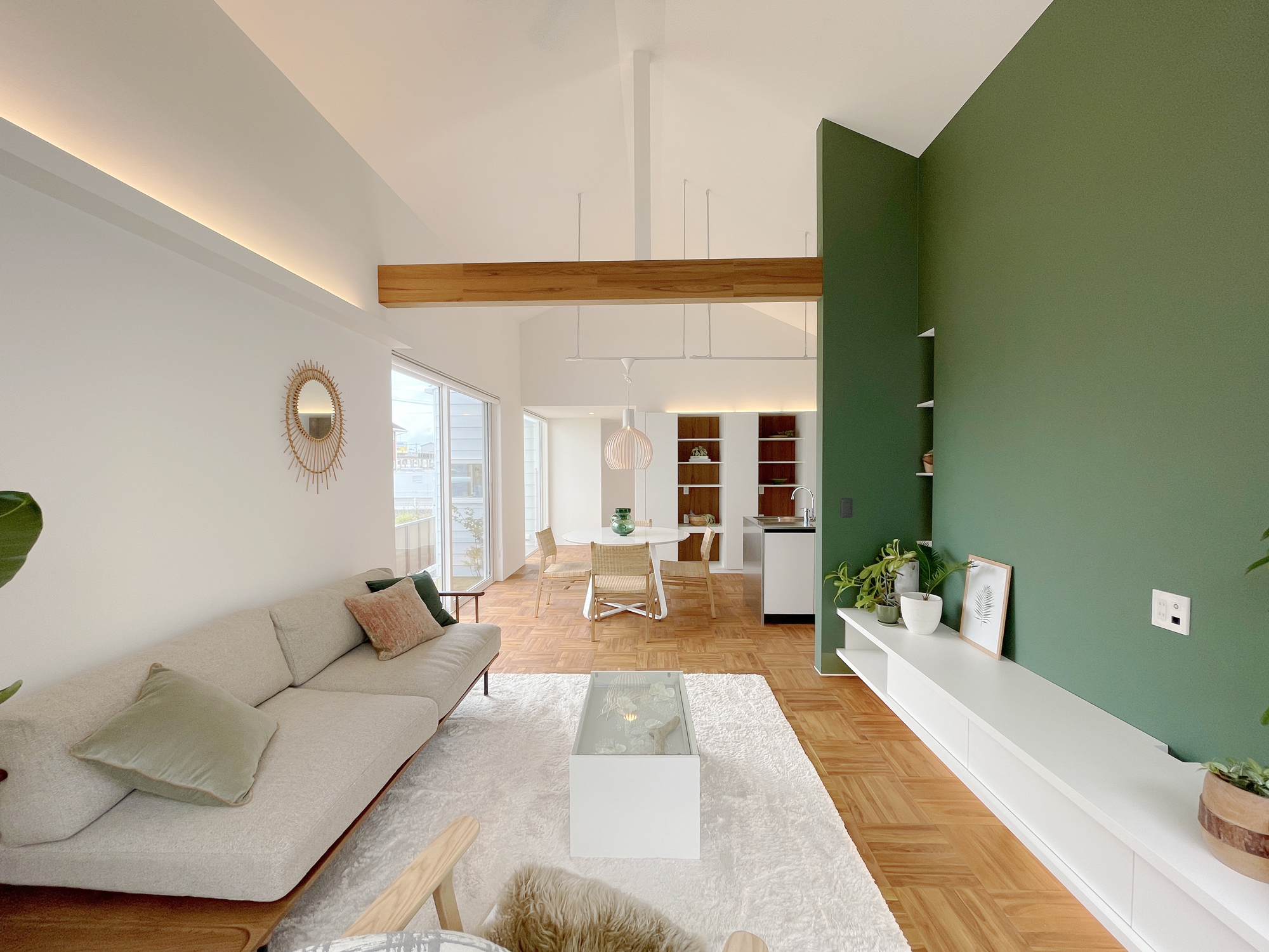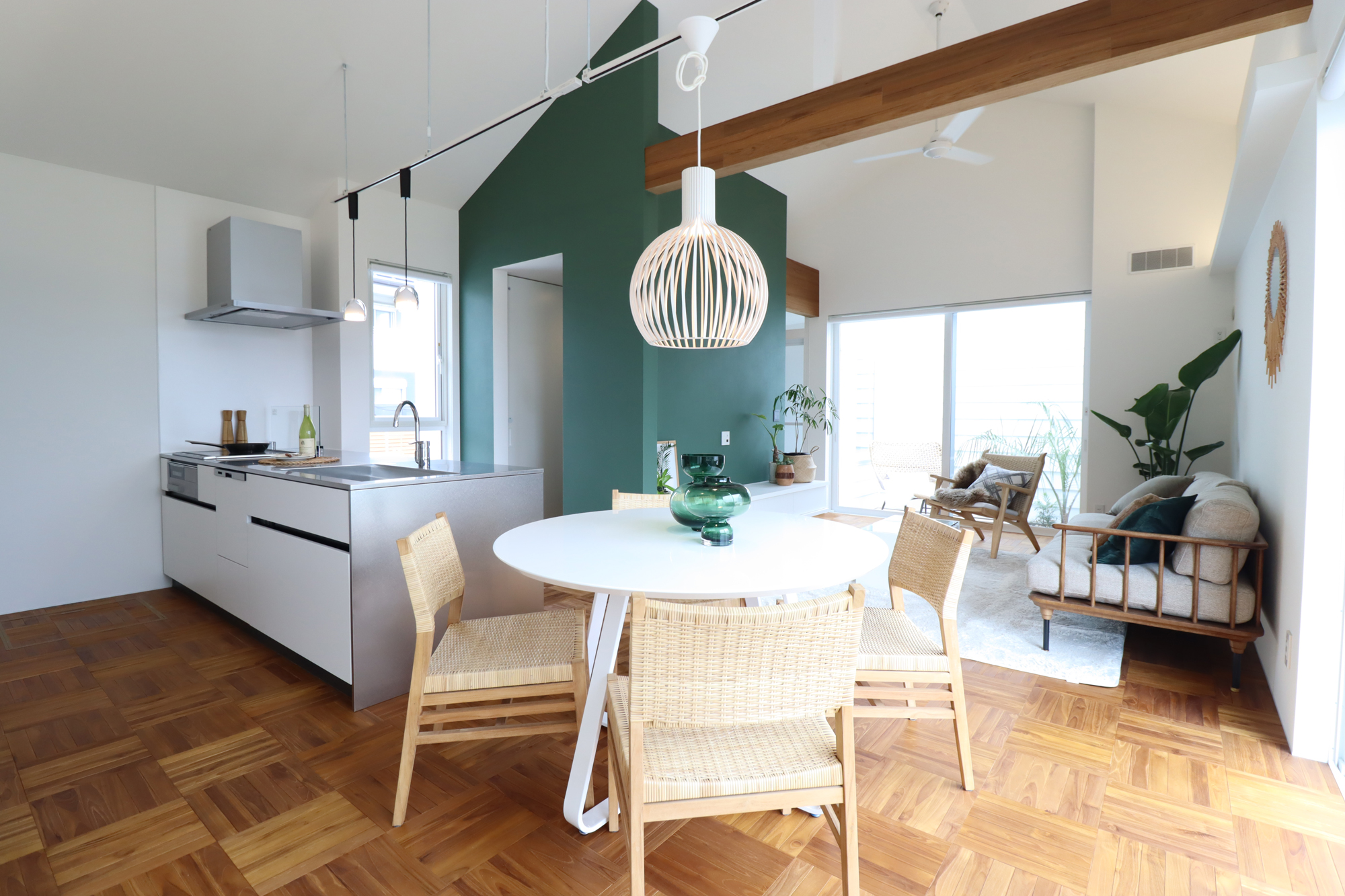 ダイニングからリビング、テラスまで視線がすっと抜ける、伸びやかなLDK。深いグリーンの壁が空間の印象を引き締めながら、照明の陰影が上質なリゾート感を演出します。テラスとつながる大きな窓が光と風を届け、家の中にいながら自然を身近に感じられる癒しの空間です