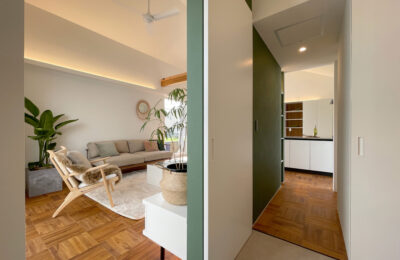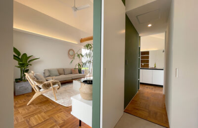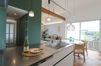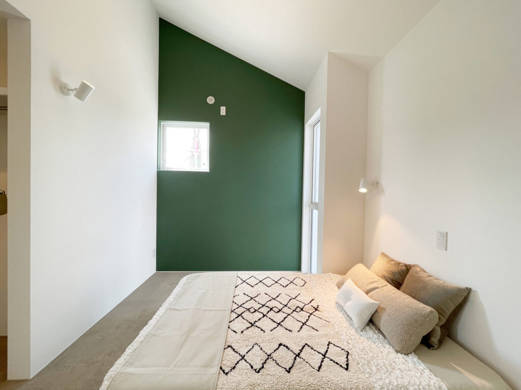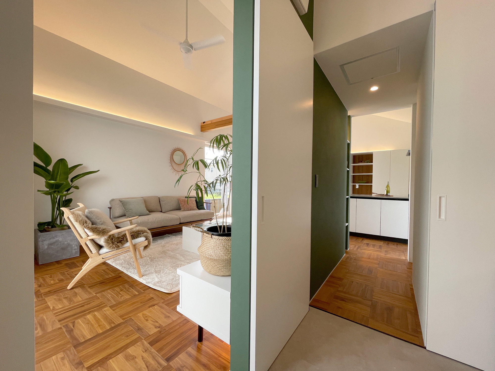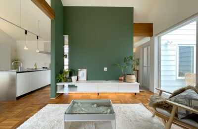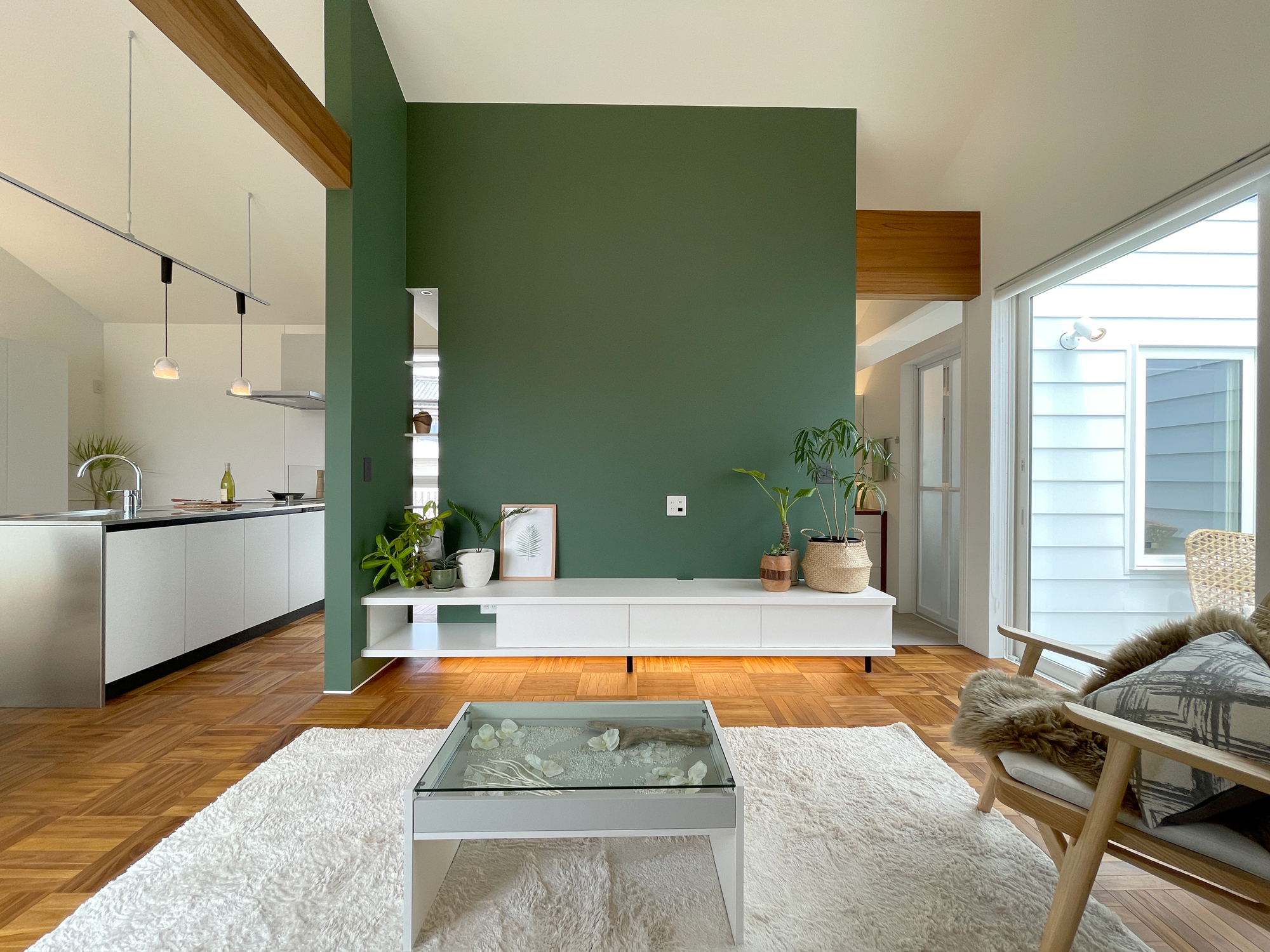 ダイニングからリビング、テラスまで視線がすっと抜ける、伸びやかなLDK。深いグリーンの壁が空間の印象を引き締めながら、照明の陰影が上質なリゾート感を演出します。テラスとつながる大きな窓が光と風を届け、家の中にいながら自然を身近に感じられる癒しの空間です