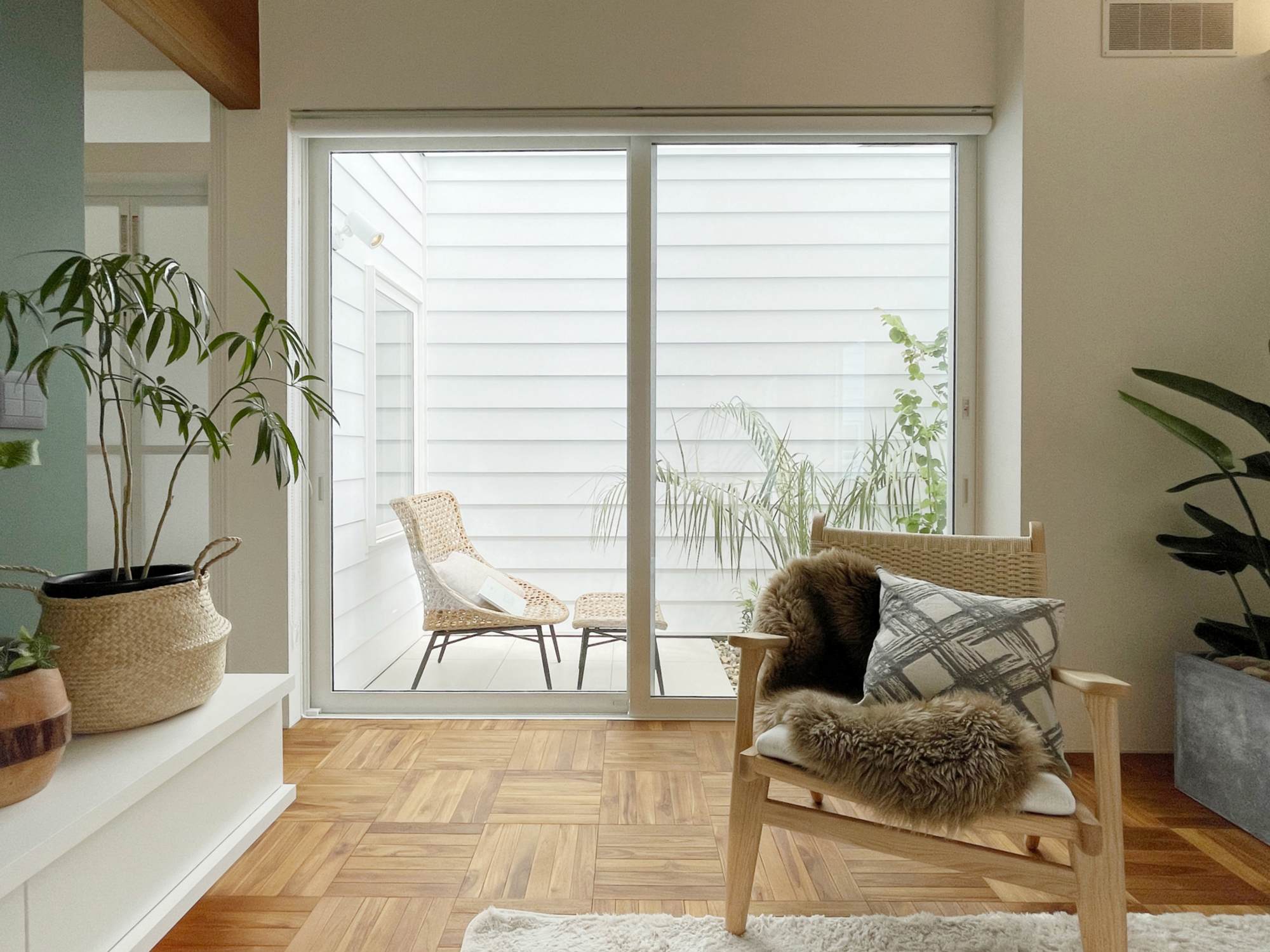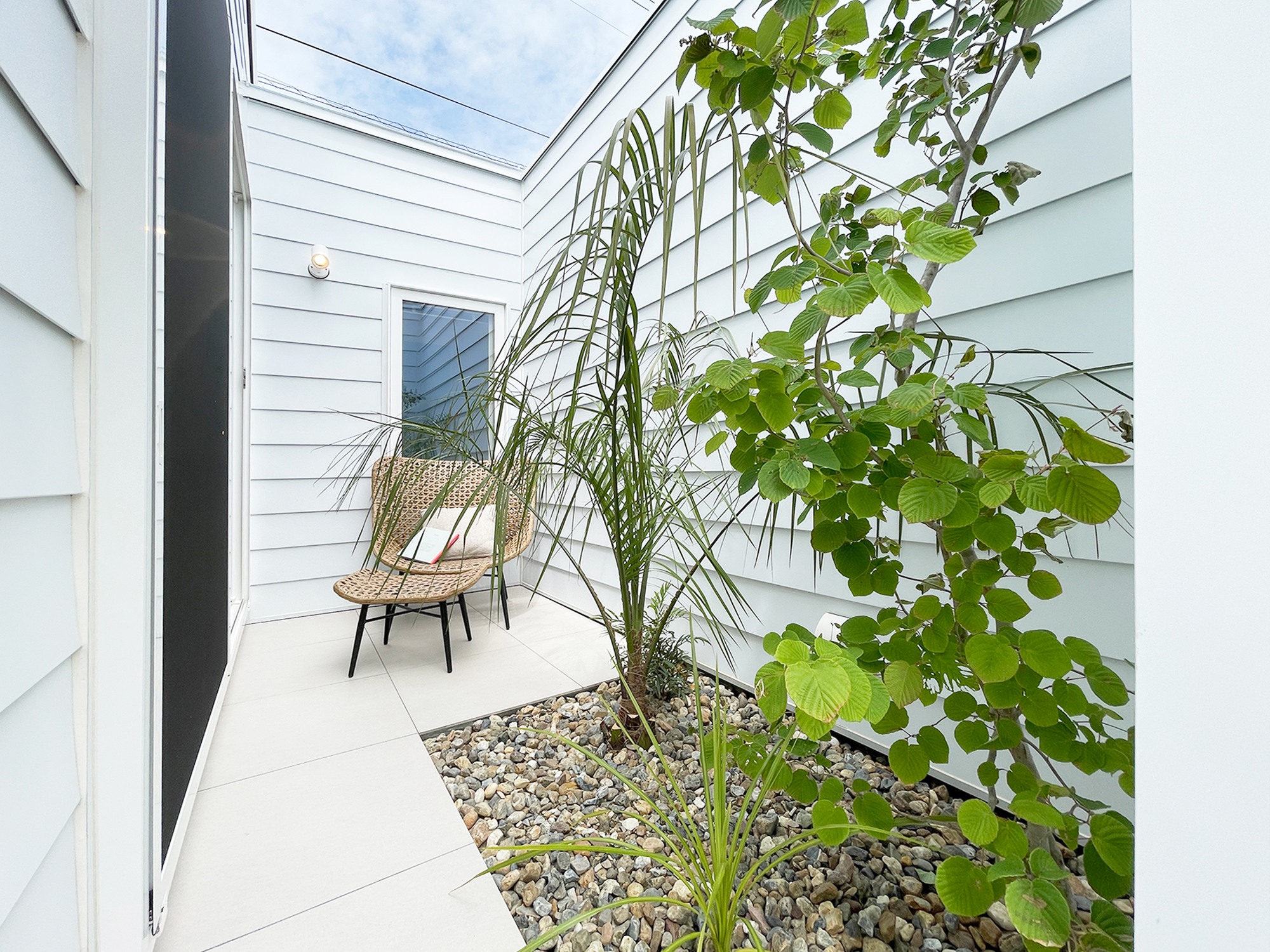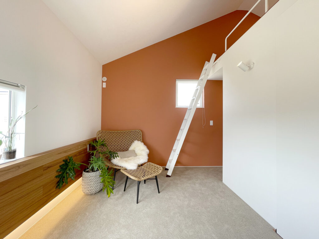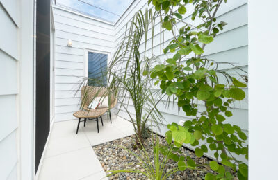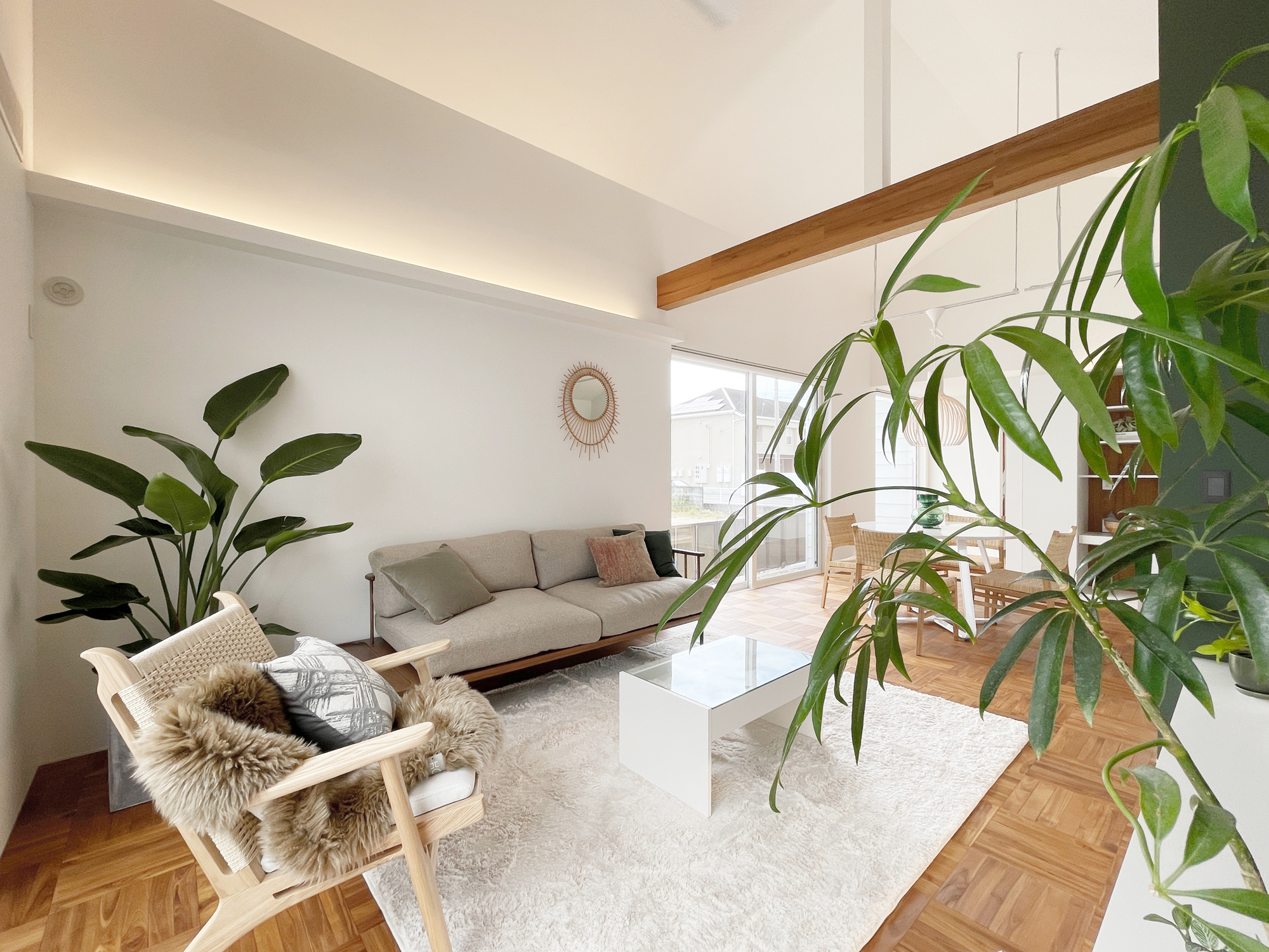 トレンドカラー×ハワイアンリゾート。勾配天井と大開口が生む、光と余白を楽しむ平屋。プライベートテラスが内と外をゆるやかにつなぎ、日常にリゾートのような開放感をもたらします。
