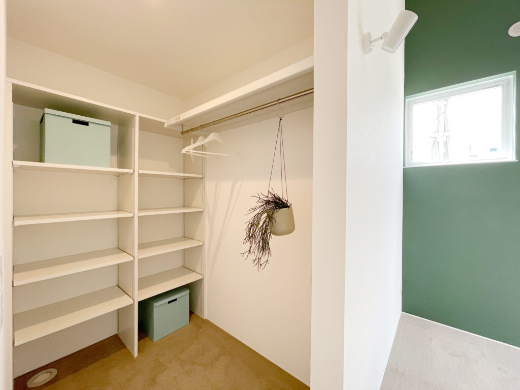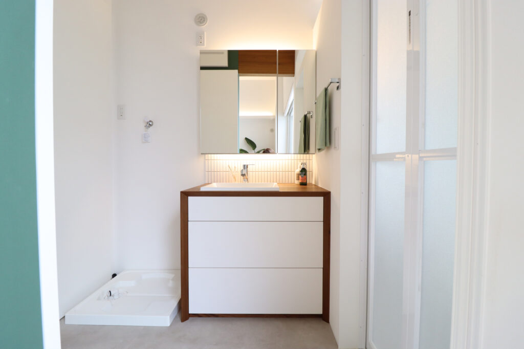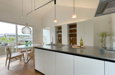 トレンドカラーを取り入れ、開放感と暮らしやすさを両立した、ハワイアンリゾート風の平屋住宅です。22帖のLDKは勾配天井と大開口によって、水平・垂直ともに広がりを感じられる設計としました。室内から連続するプライベートテラスとウッドデッキが、内と外の境界を曖昧にし、空間に奥行きを与えます。カーテンレスでも成立する窓配置や、素材・色味のバランスにも配慮し、非日常感と上質さを静かに纏った住まいに仕上げました。