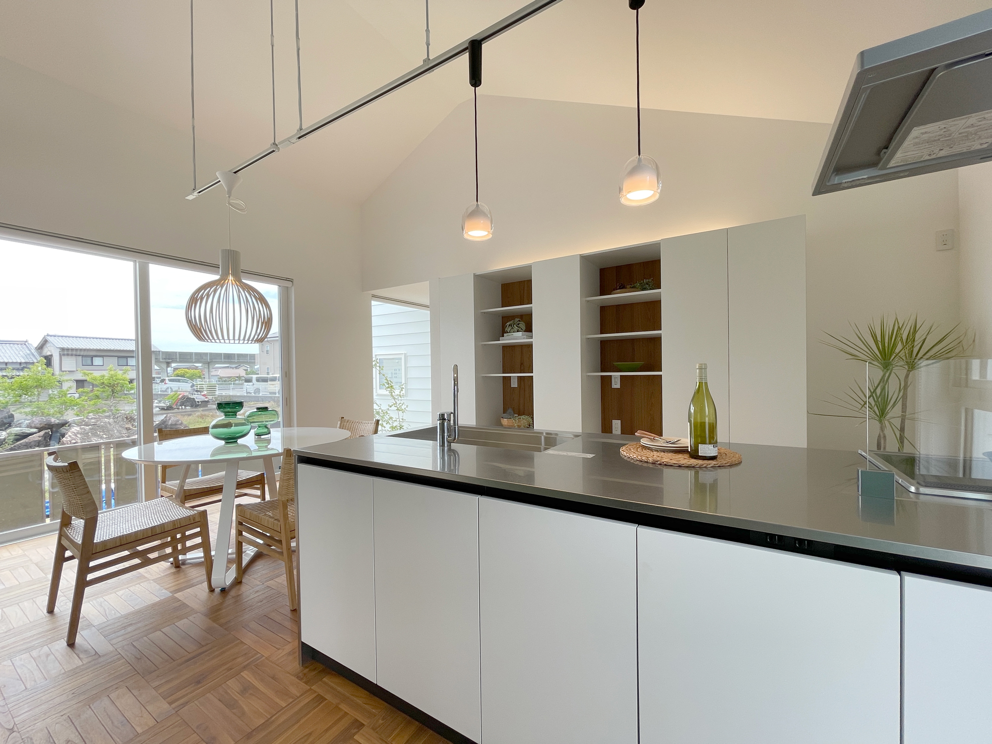白とステンレスのシンプルなキッチンに、木の床とラタンチェアが自然なあたたかさを添えるダイニングキッチン。落ち着いたカラーコーディネートが空間全体をやさしくまとめ、まるでリゾートホテルのラウンジのような穏やかな雰囲気で食卓を囲めます。