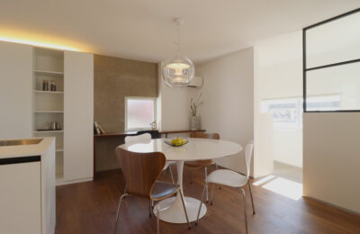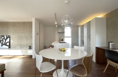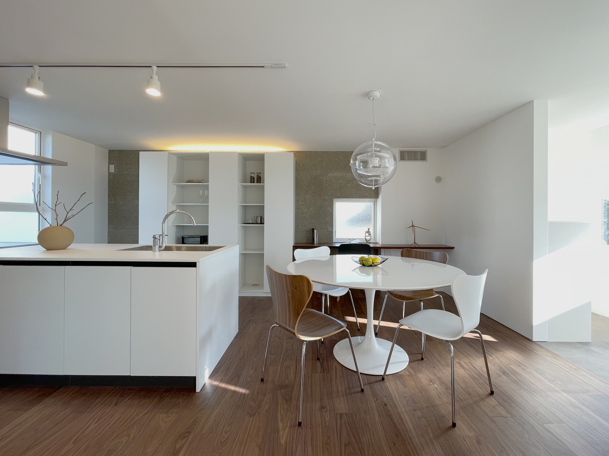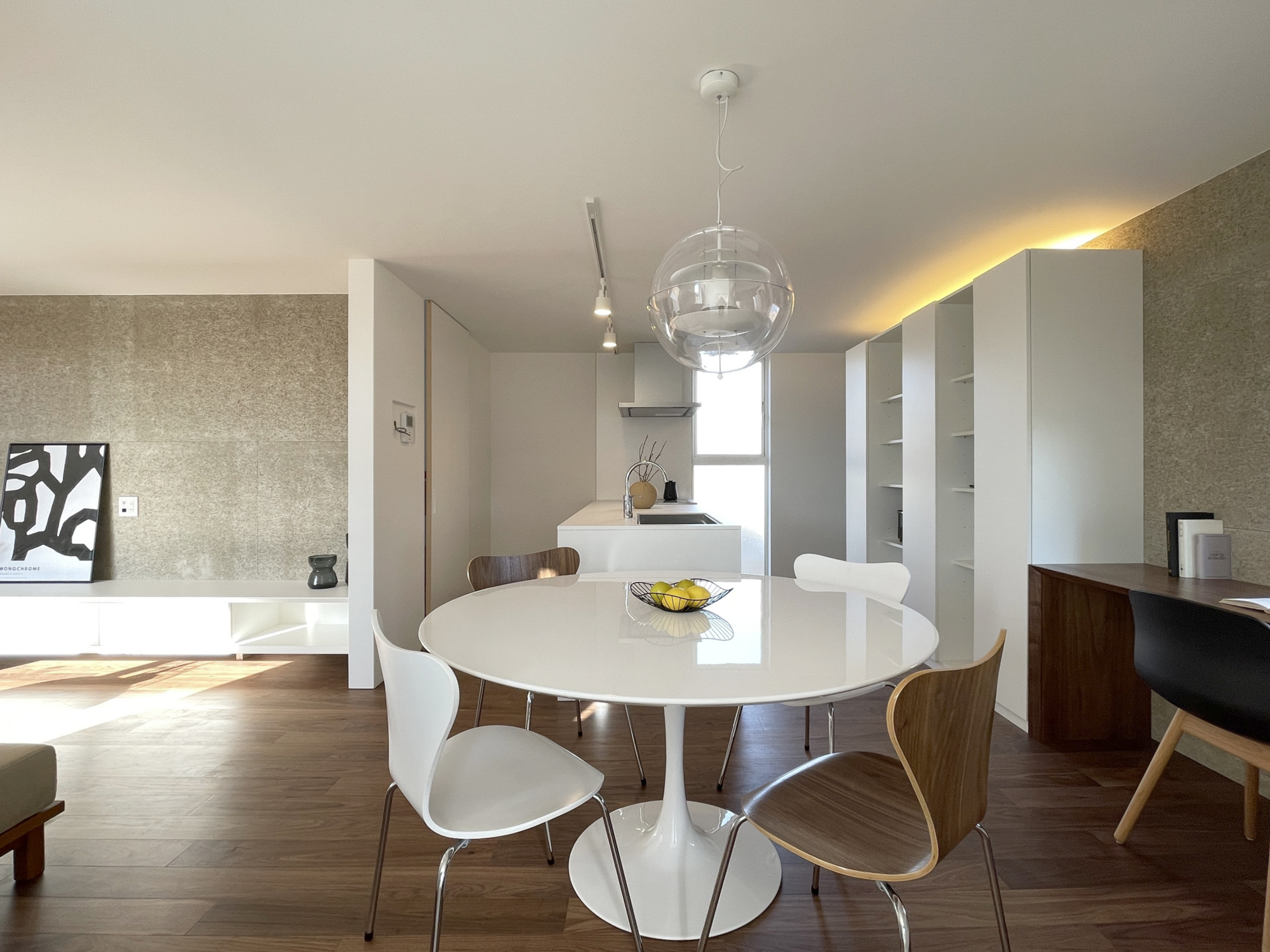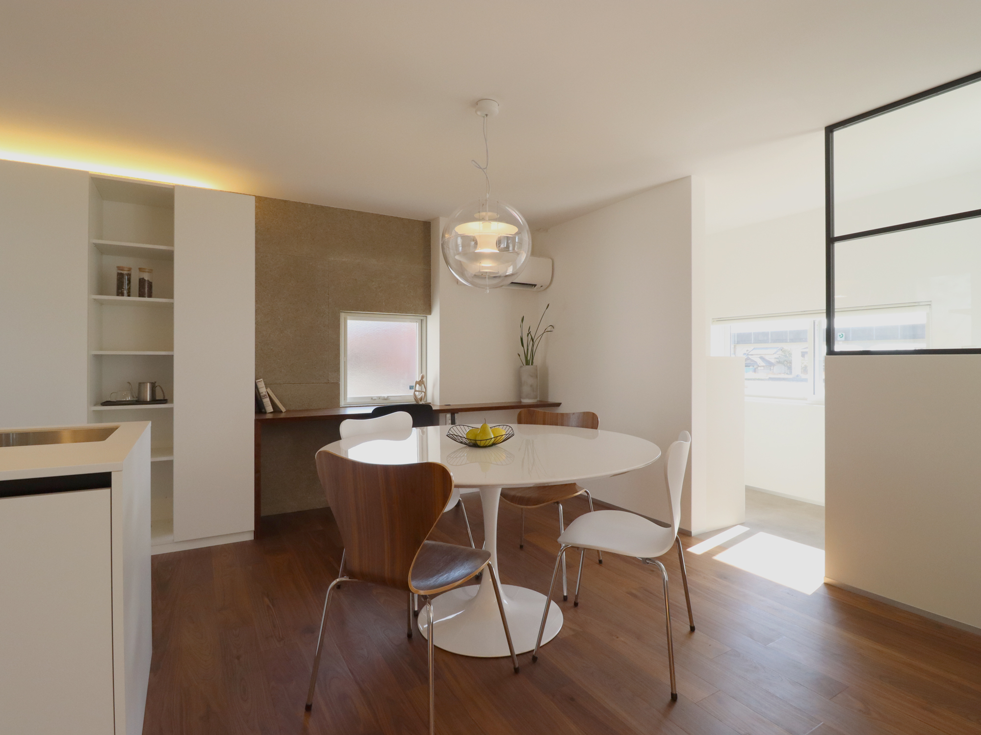 ダイニングは動線を意識した配置とし、日々の食事や会話が暮らしの中心になるよう計画しました。円形テーブルを囲むことで、動線や視線に角が生まれず、やわらかな一体感が生まれます。背後には収納とカウンターを設け、使いやすさと見た目の整いを両立しています。