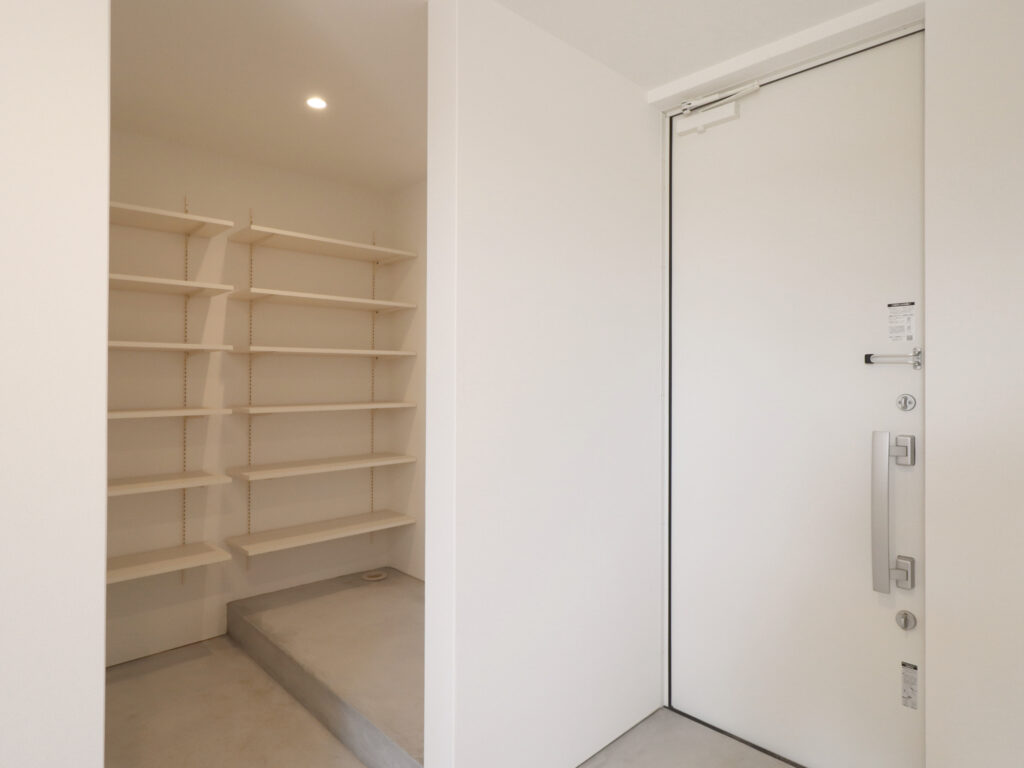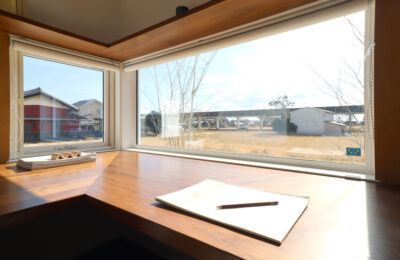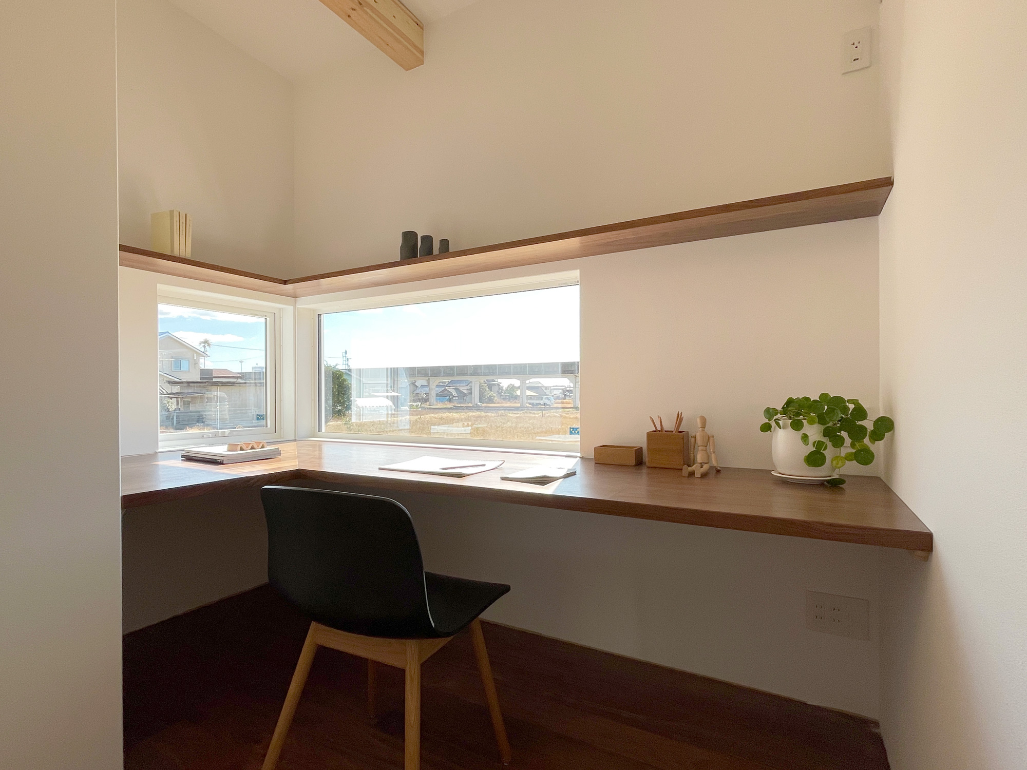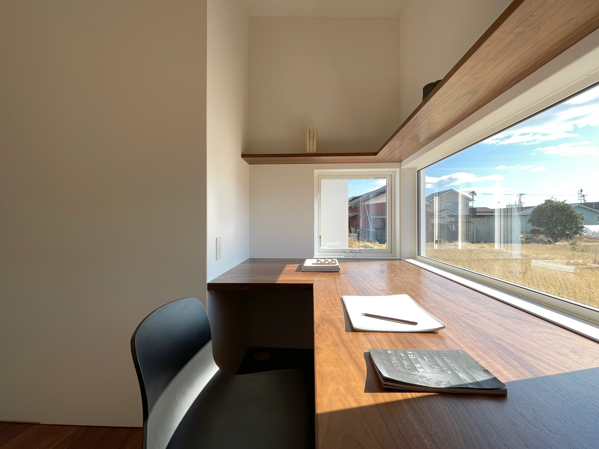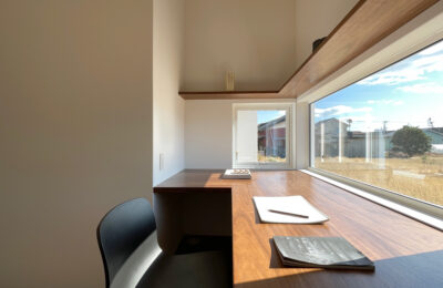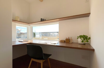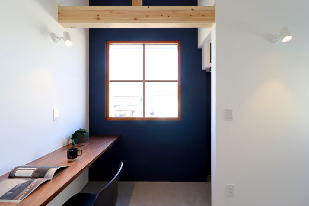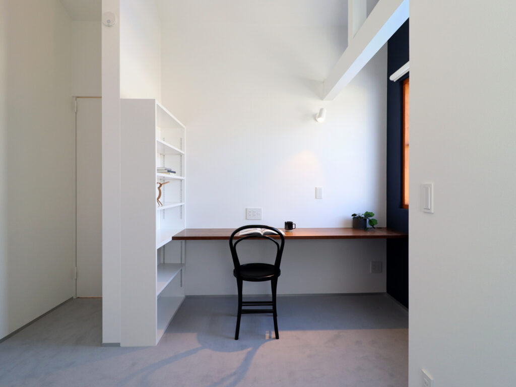 庭に向かって開かれた、独立性のあるアトリエ空間。造作デスクと収納棚を備え、仕事や趣味に集中できる環境を整えました。窓からは自然光と外の景色を取り込みつつ、LDKとはほどよく距離を保ち、オンとオフを切り替えやすい一室としています。