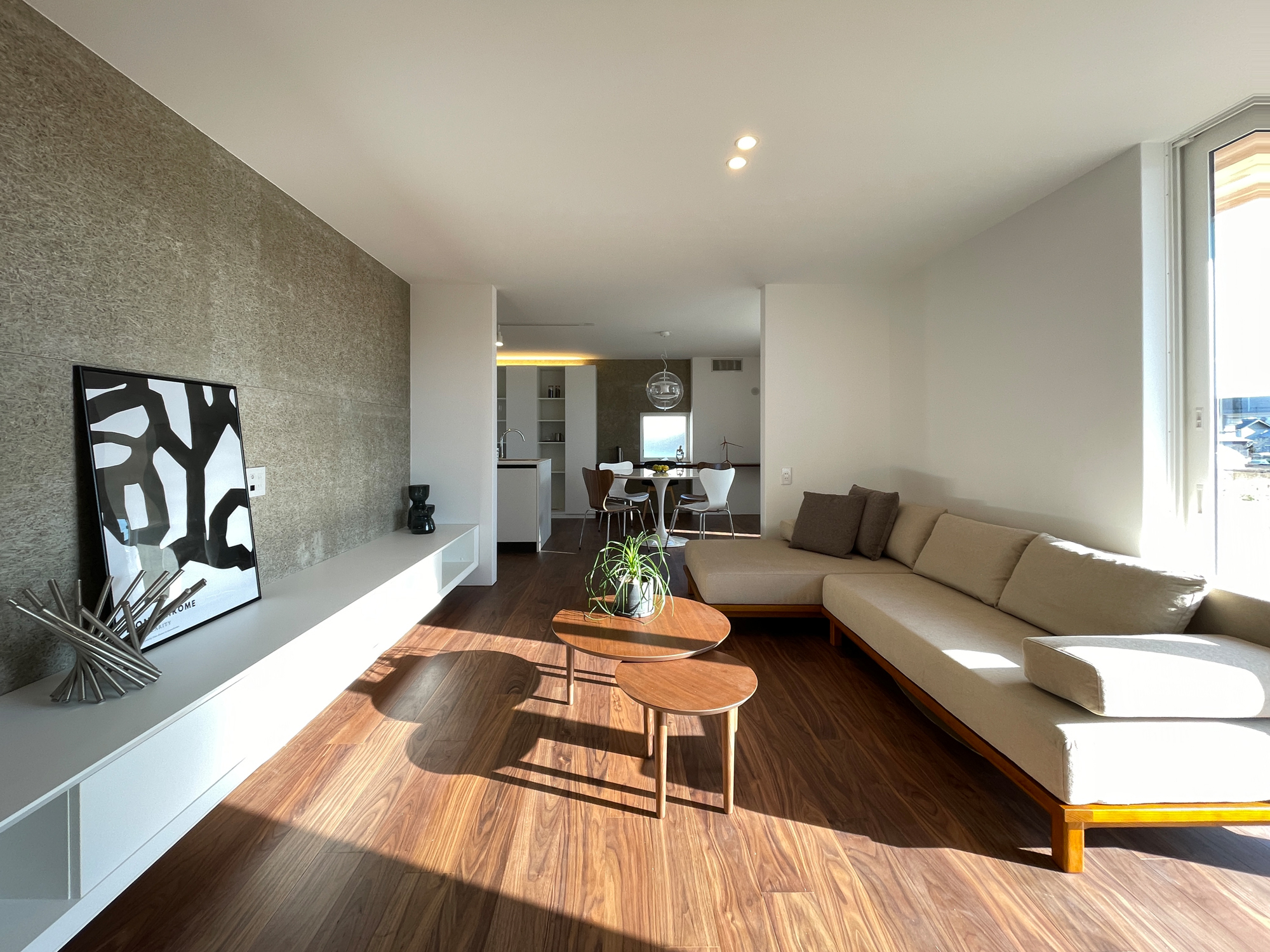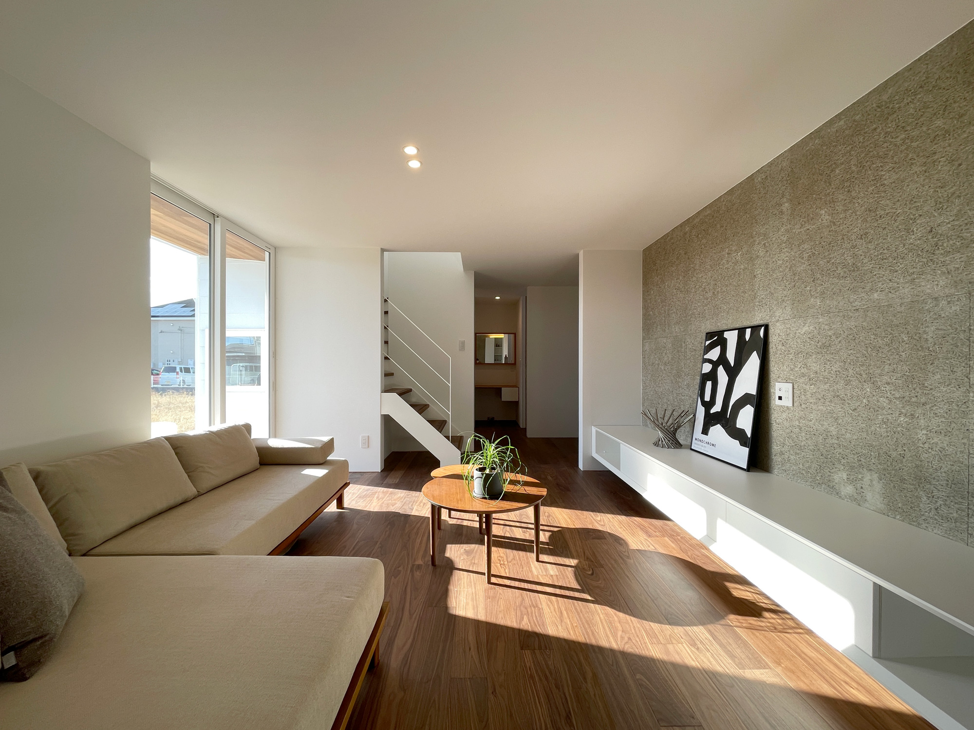 素材感のある木毛セメント板を設え、落ち着いた表情をつくったリビング。低く抑えたインテリアで、視線を遮りすぎない設えとしています。大きな開口から差し込む光が床に落ち、時間帯によって表情を変えながら、落ち着いた時間を心地よく過ごせる空間に仕上げました。