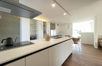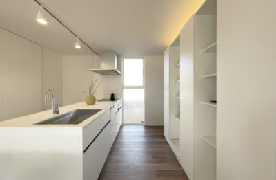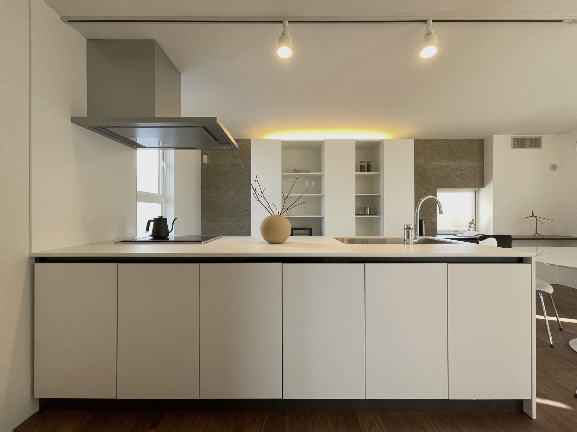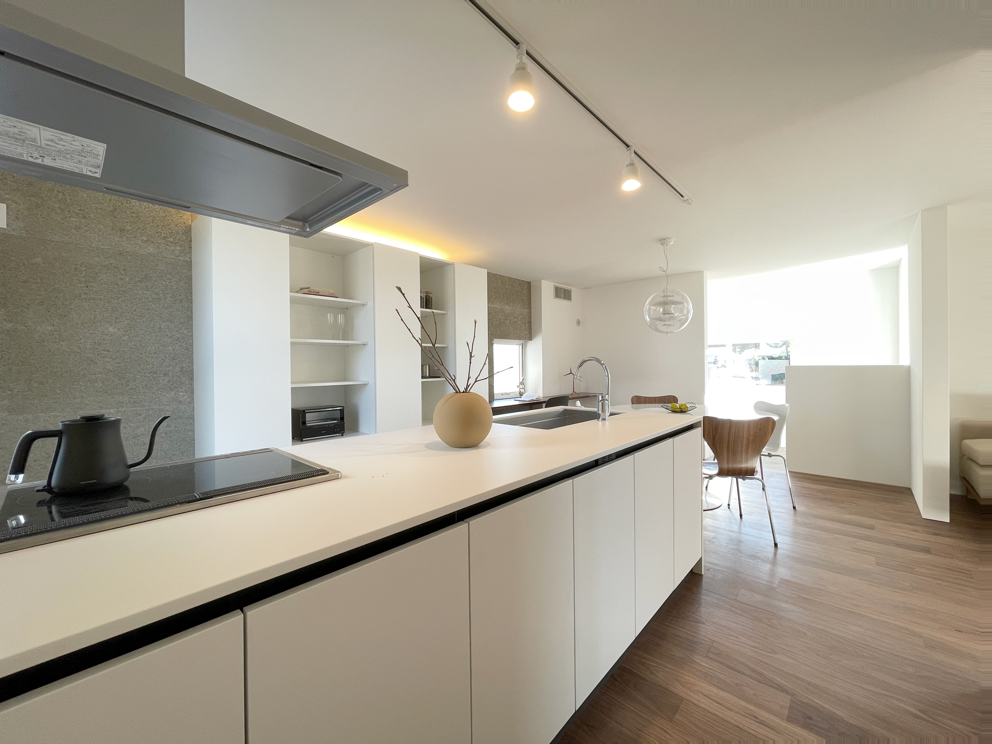 白を基調としたキッチンは、空間に溶け込みながらも端正な存在感を放ちます。アイランド型とすることで作業動線を確保しつつ、LDK全体とのつながり←を意識しました。背面収納や間接照明によって、生活感を抑えながら、日常使いしやすいキッチンに仕上げています。