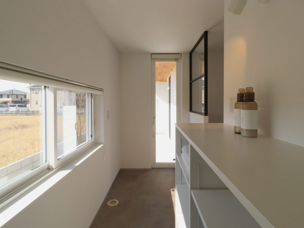 この住まいでは、日常の中に落ち着いて向き合える場所をつくることを意識しました。アトリエは、LDKとほどよい距離を保った書斎として設え、光や庭の気配を感じながら集中できる環境としています。また、水まわりから物干しまでの動線を整理し、日々の洗濯が無理なく完結する計画としました。暮らしのリズムに合わせて使い分けられる居場所が、自然と日常に馴染む住まいを目指しています。