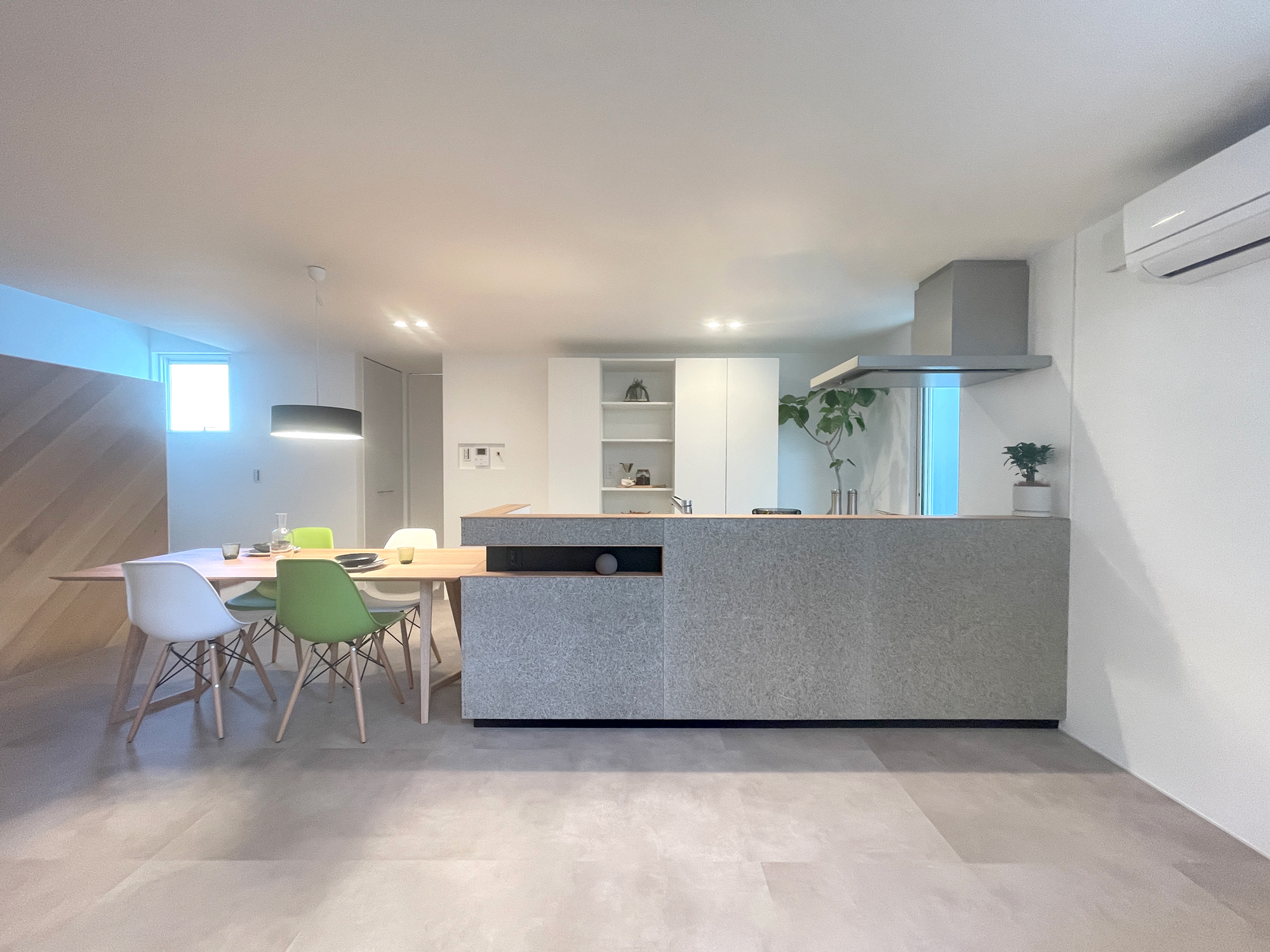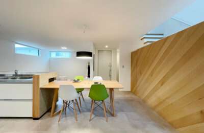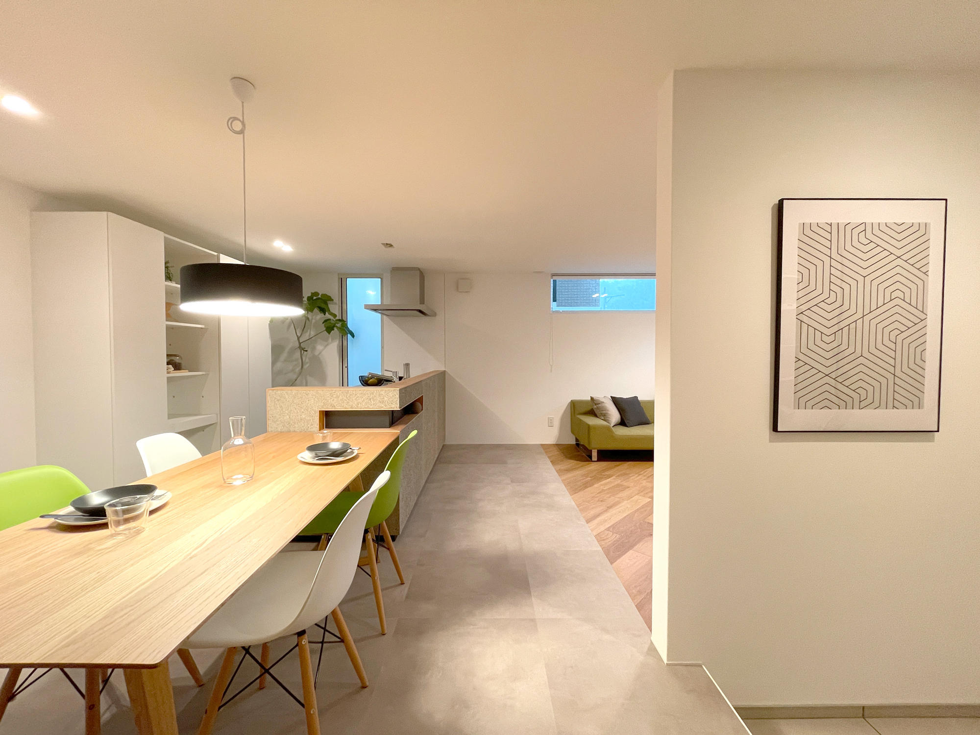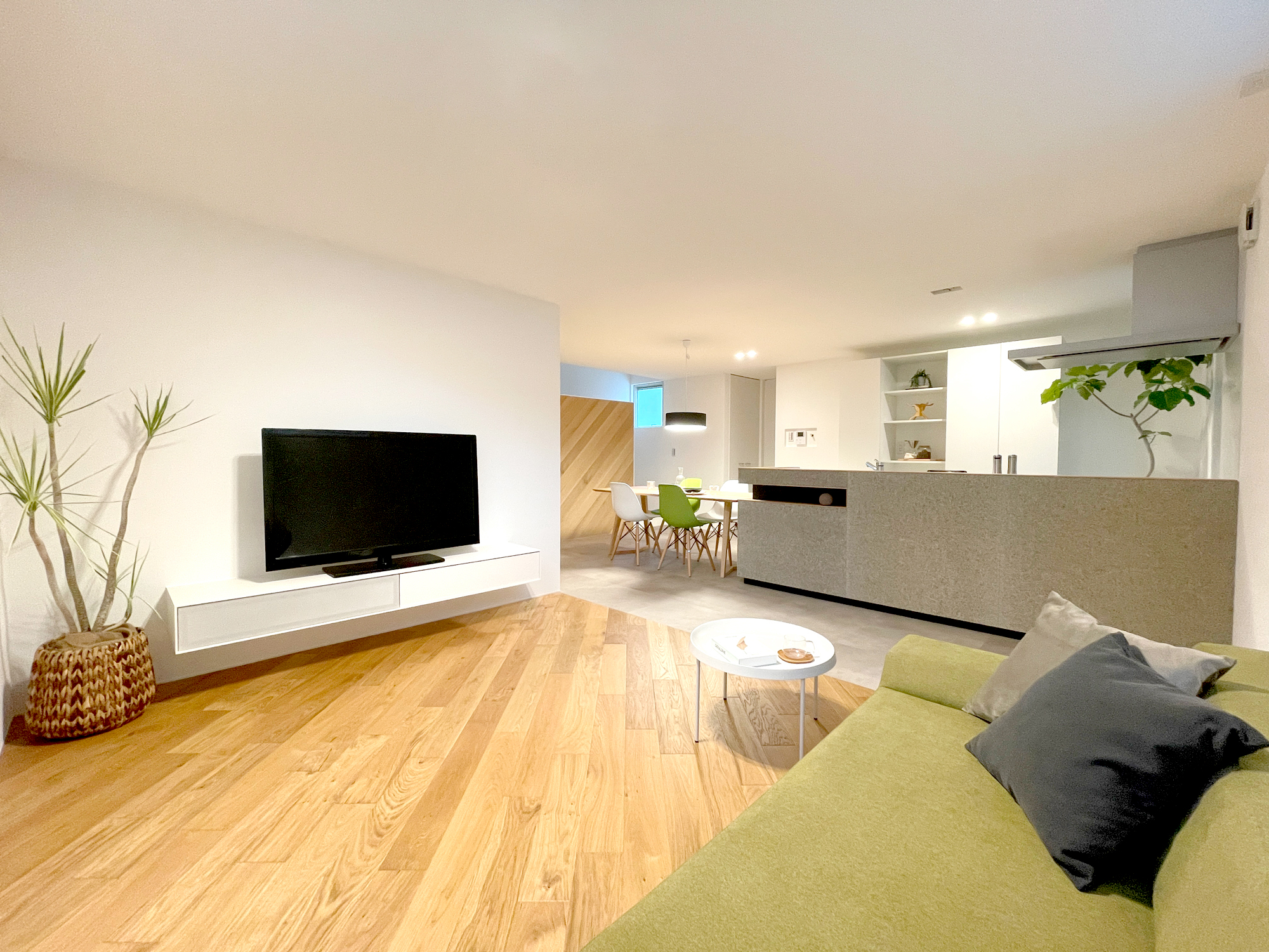 木とグレートーンをベースに、床の切り替えで自然と空間を分けたLDK。造作のTVボードや腰壁キッチンで、生活感を抑えながら、すっきりとした印象にまとめました。差し色に取り入れた大人グリーンの家具が、毎日の時間にやさしい心地よさを添えてくれます。