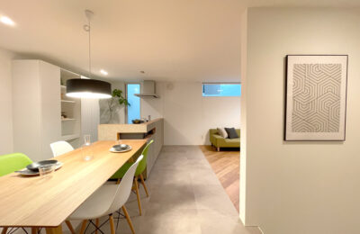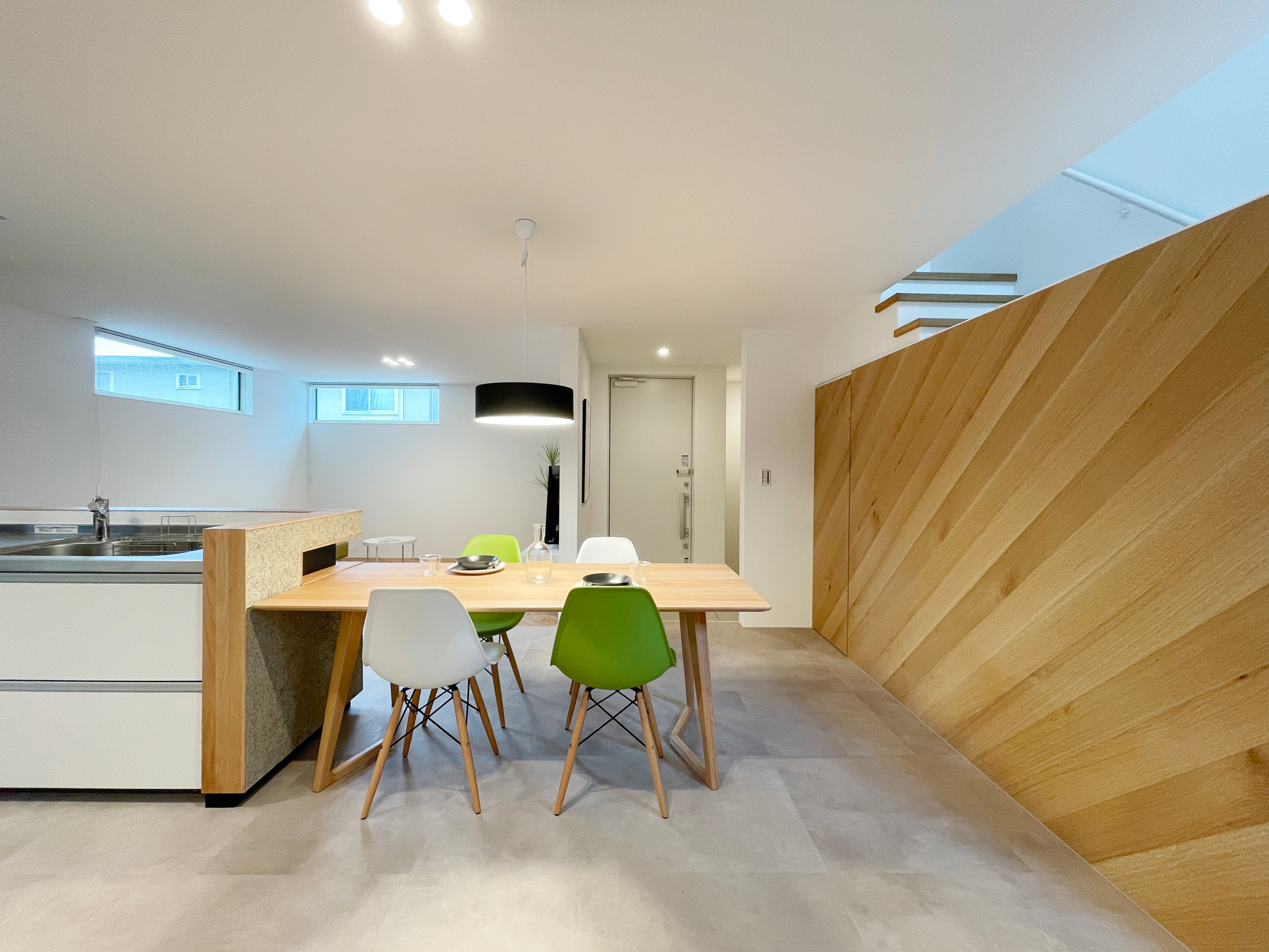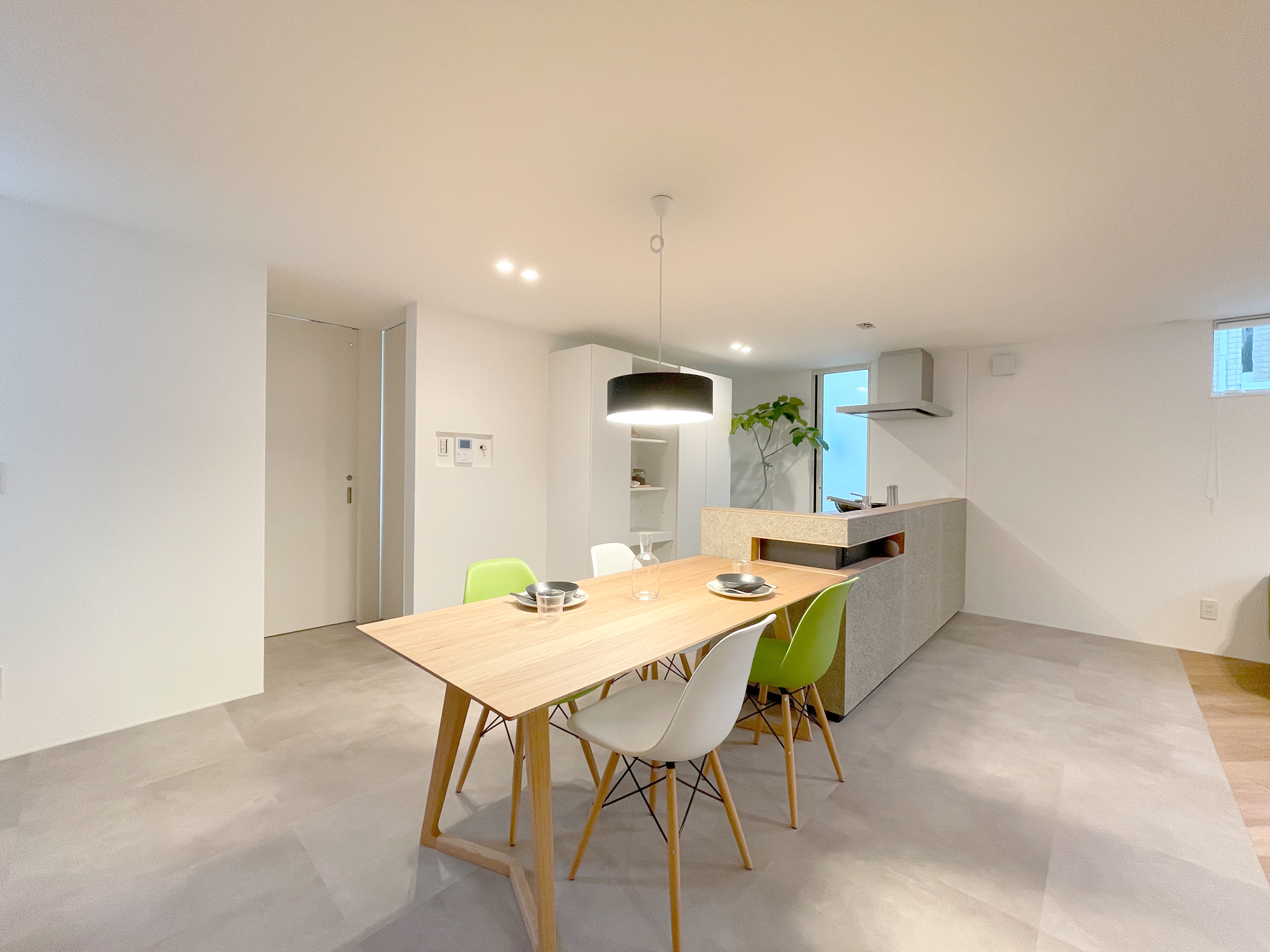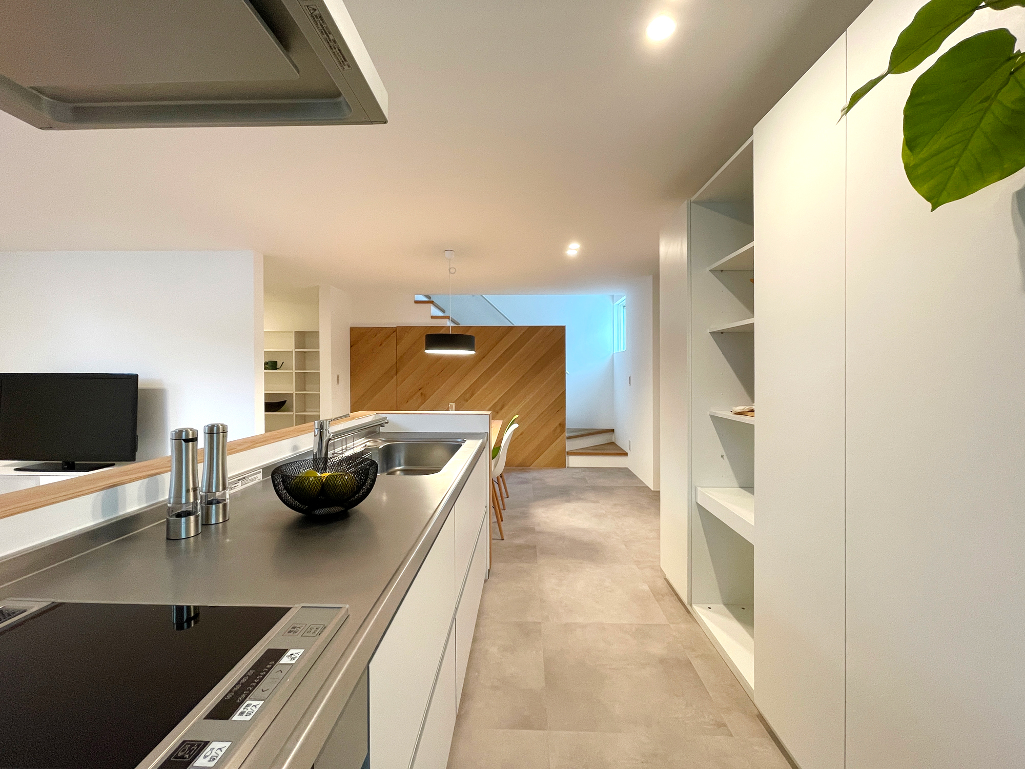 木とグレートーンをベースに、床の切り替えで自然と空間を分けたLDK。造作のTVボードや腰壁キッチンで、生活感を抑えながら、すっきりとした印象にまとめました。差し色に取り入れた大人グリーンの家具が、毎日の時間にやさしい心地よさを添えてくれます。