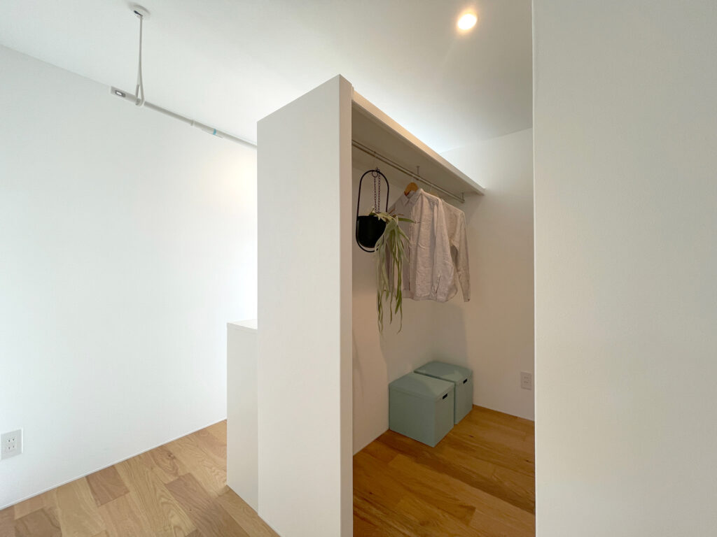 この住まいは、気張らず毎日の暮らしが自然と快適になるよう考えた設計です。コンパクトながら無駄のない水廻り動線と、必要な場所に十分な収納を配置し、家事や生活がスムーズに進むよう計画しました。玄関からリビングへと抜けると、自然と家族が集まるLDKが広がります。床材を木とグレーの質感で切り替えることで、空間をやさしくゾーニングしながら、一体感のある心地よさを演出。大人グリーンの家具が落ち着いた空間のアクセントとなり、住みはじめたその日から“ちょうどいい暮らし”を実感できる、機能とデザインが調和した住まいです。