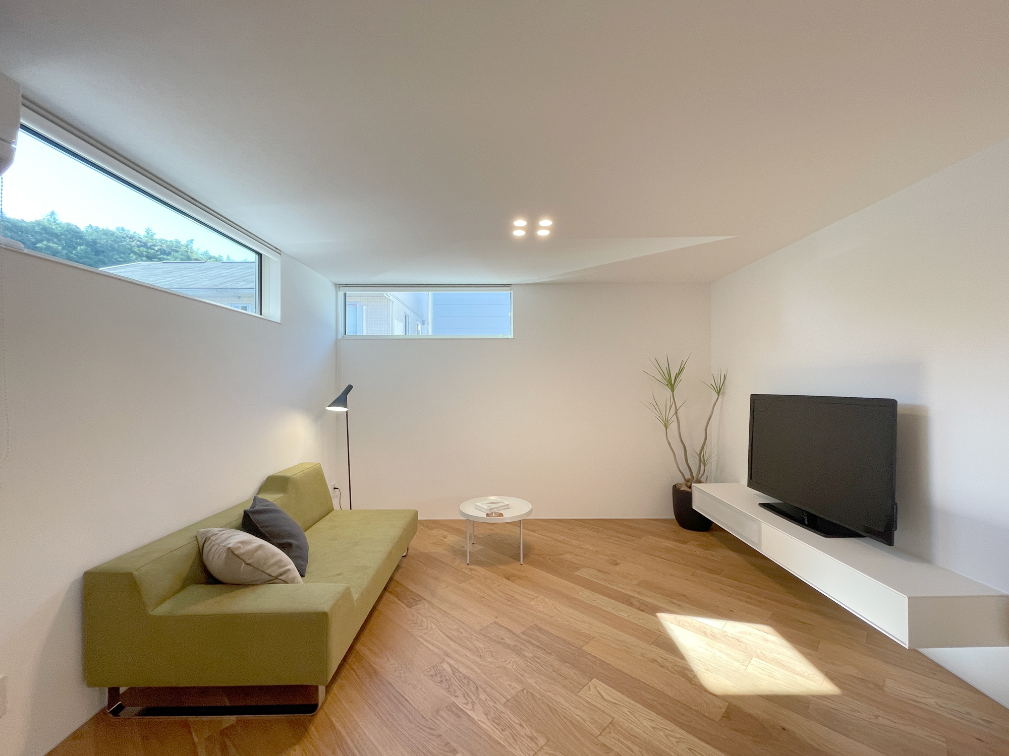 シンプルな空間の中に遊び心が映える床の切り替え施工。足触り良く暖かさを感じながら家族団らんの場になるよう、生活をイメージしました。視線の高さを抑えた家具と横長の窓が、空間に広がりとやさしい明るさまでもたらします。