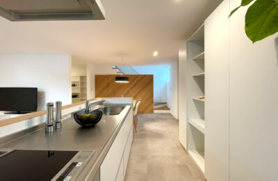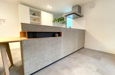 腰壁部分に木毛セメント板を施し、システムキッチンとは思えないデザインで仕上げたキッチン。グレートーンと木の組み合わせが、空間に落ち着いた雰囲気をつくります。ダイニングやリビングとの距離も近く、料理をしながら家族の気配を感じられる、使い勝手のよいキッチンです。