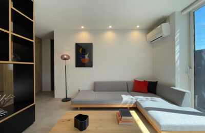 上品さと快適さを両立した、ホテルライクなリビング空間。小口に木を見せた造作シェルフや、落ち着いたベースカラーへの差し色がオランダらしいアクセントを加えます。