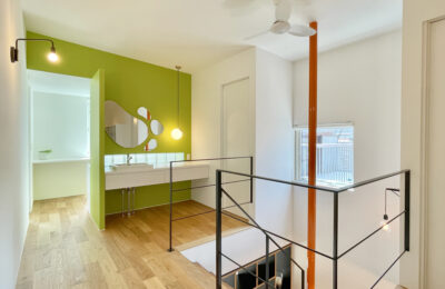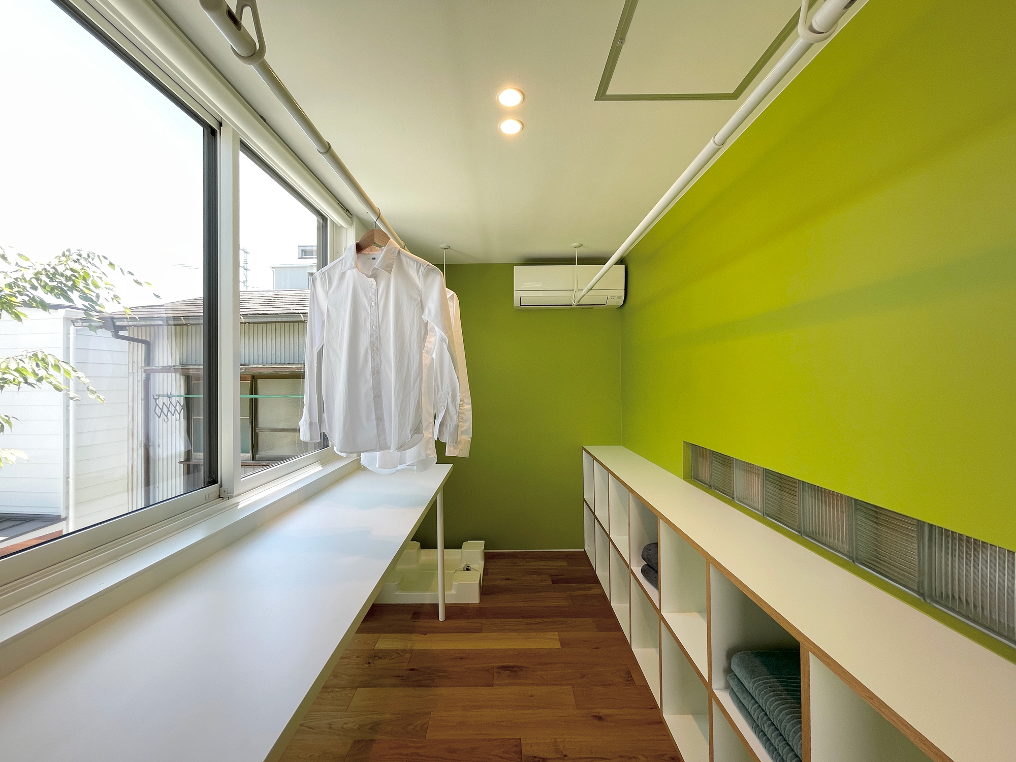 2階にまとめた水回りは、暮らしの流れそのものを美しく整える空間。グリーンのアクセントウォールと有機的なミラーが、オランダデザインらしい遊び心を添える。洗う・干す・しまうが一カ所で完結する動線計画により、家事の負担を軽減しながら、空間としての心地よさも両立しています。