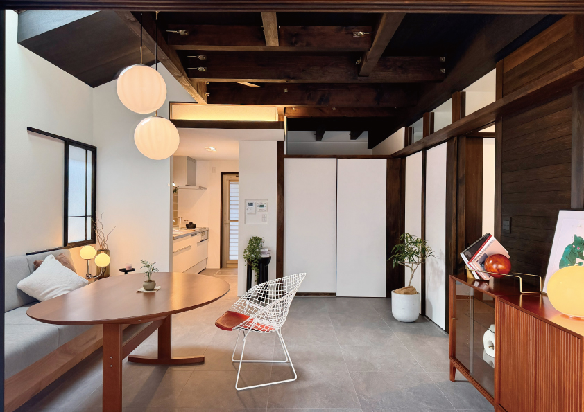 築25年のよくある住宅の経年劣化した梁や柱に、伝統的な「墨色」で着色し、古材のような深い味わいに仕上げました。