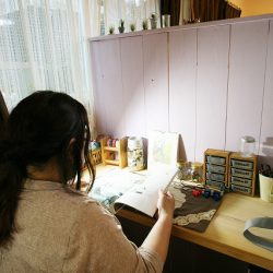 ダイニングテーブルのうしろにある空間は奥さまが「こういうの欲しいね」と旦那さまにリクエストしたところ。少しズレたビスの位置が手づくりのあたたかさを滲ませます。ミシンやパソコン、書き物をする時は食卓を散らかさず、かわいく目隠しできるようになりました。これでもまだ製作途中。最後にお気に入りのステンドグラスを入れたら完成です。「次は何をつくろうか?」と二人で話すことも増え、いっしょに雑貨屋さんへ出かけるようにもなりました。